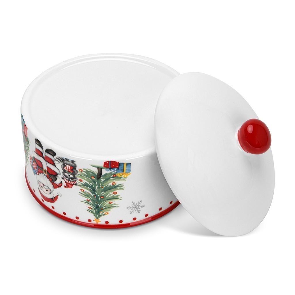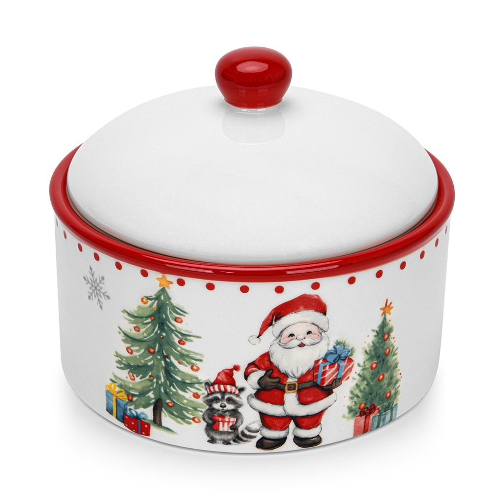 Яскравий та душевний дизайн із зображенням Діда Мороза, ялинок, подарунків та сніжинки створює святкову атмосферу. Червоний кант по периметру та глянсова кришка з червоною ручкою додають завершеності образу.