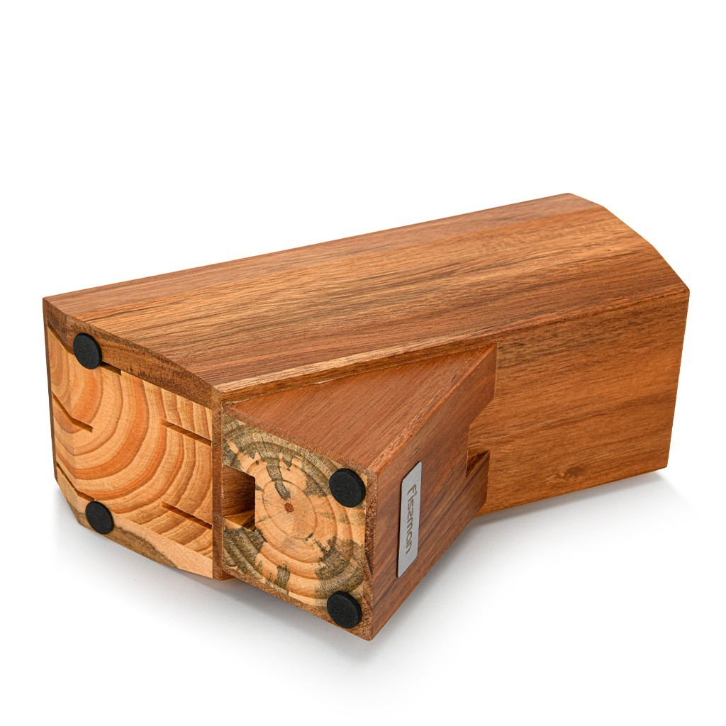 Підставка, виконана з твердої деревини гевеї в натуральному кольорі, чудово впишеться в інтер'єр кухні, забезпечить безпечне зберігання та заощадить простір, а вбудоване точило з алмазним камінням допоможе завжди тримати гострі ножі.