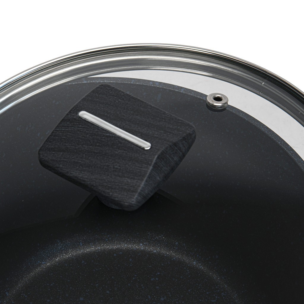 • Прозрачная стеклянная крышка с паровыпуском позволяет наблюдать за готовностью пищи, не открывая посуду, тем самым, исключая попадания брызг на кожу и одежду.