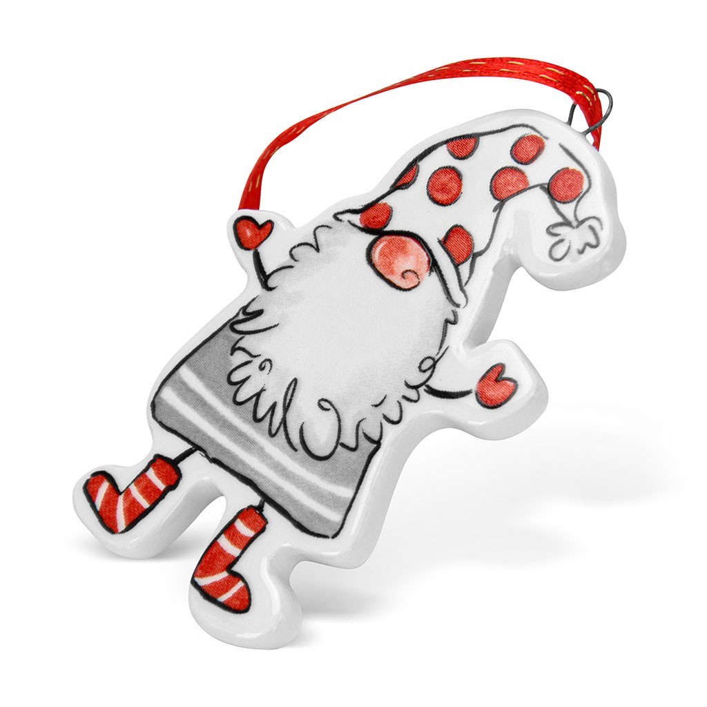 Ёлочная игрушка гармонично сочетается с другими элементами новогоднего декора, такими как новогодние ёлочные игрушки, шишки, свечи, мандарины или палочки корицы. Он может стать центральным элементом композиции, особенно если украсить его гирляндой. Рисунок гнома нанесён на обе стороны игрушки, что позволяет использовать её в любом положении.