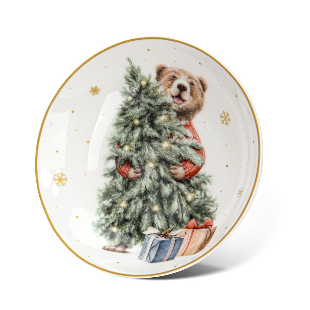 Новогодняя коллекция MIRACLE от FISSMAN создана для тех, кто ценит детали в сервировке. Блюдце диаметром 10 см украшено изображением медведя с ёлкой и подарками, дополнено золотыми снежинками и тонким кантом. Оно не только практично, но и создаёт праздничную атмосферу за столом.