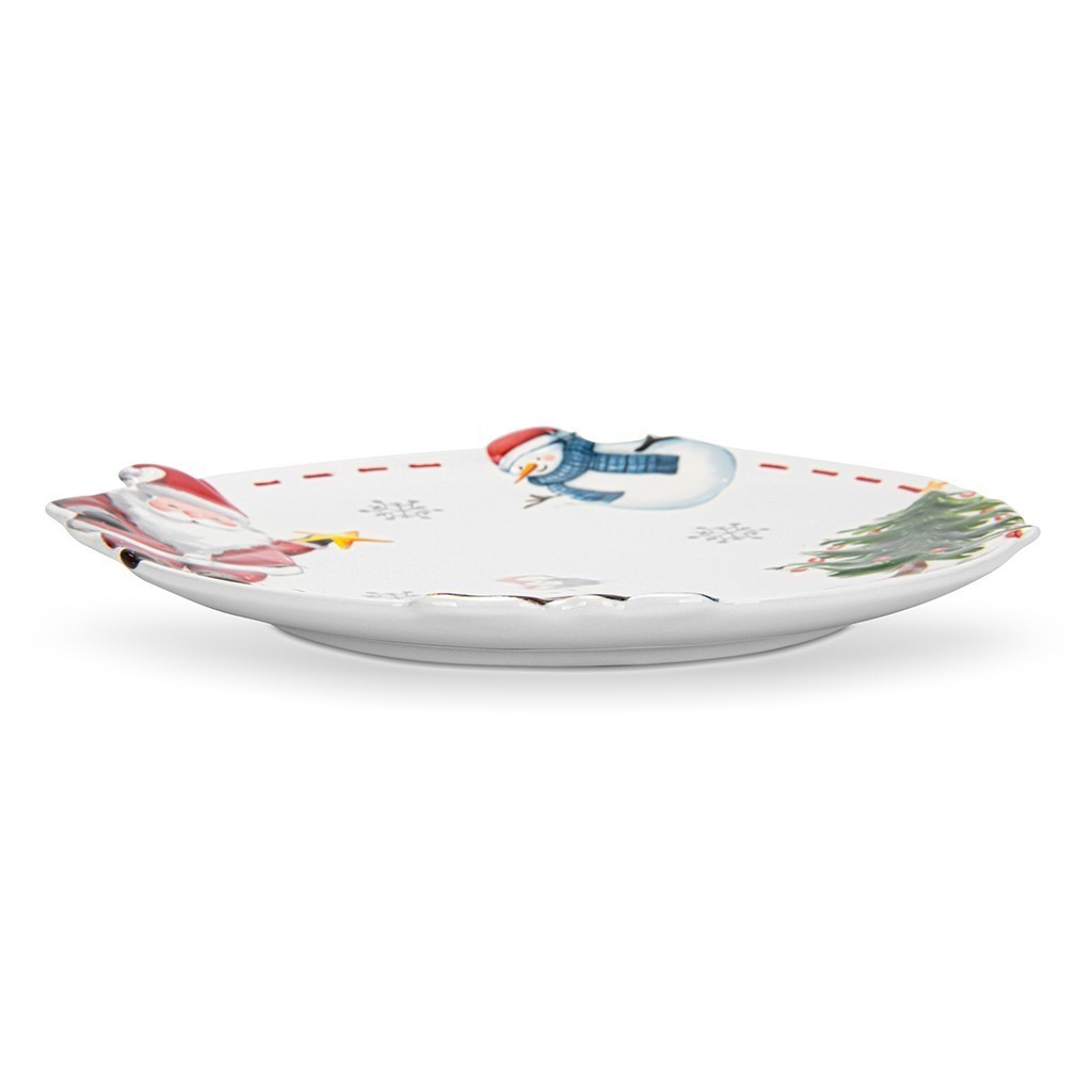 На поверхности тарелки расположены объёмные новогодние изображения, которые выступают за край тарелки, создавая динамичный визуальный эффект. Красный пунктирный контур по краю и снежинки гармонично дополняют композицию, усиливая ощущение зимней атмосферы.