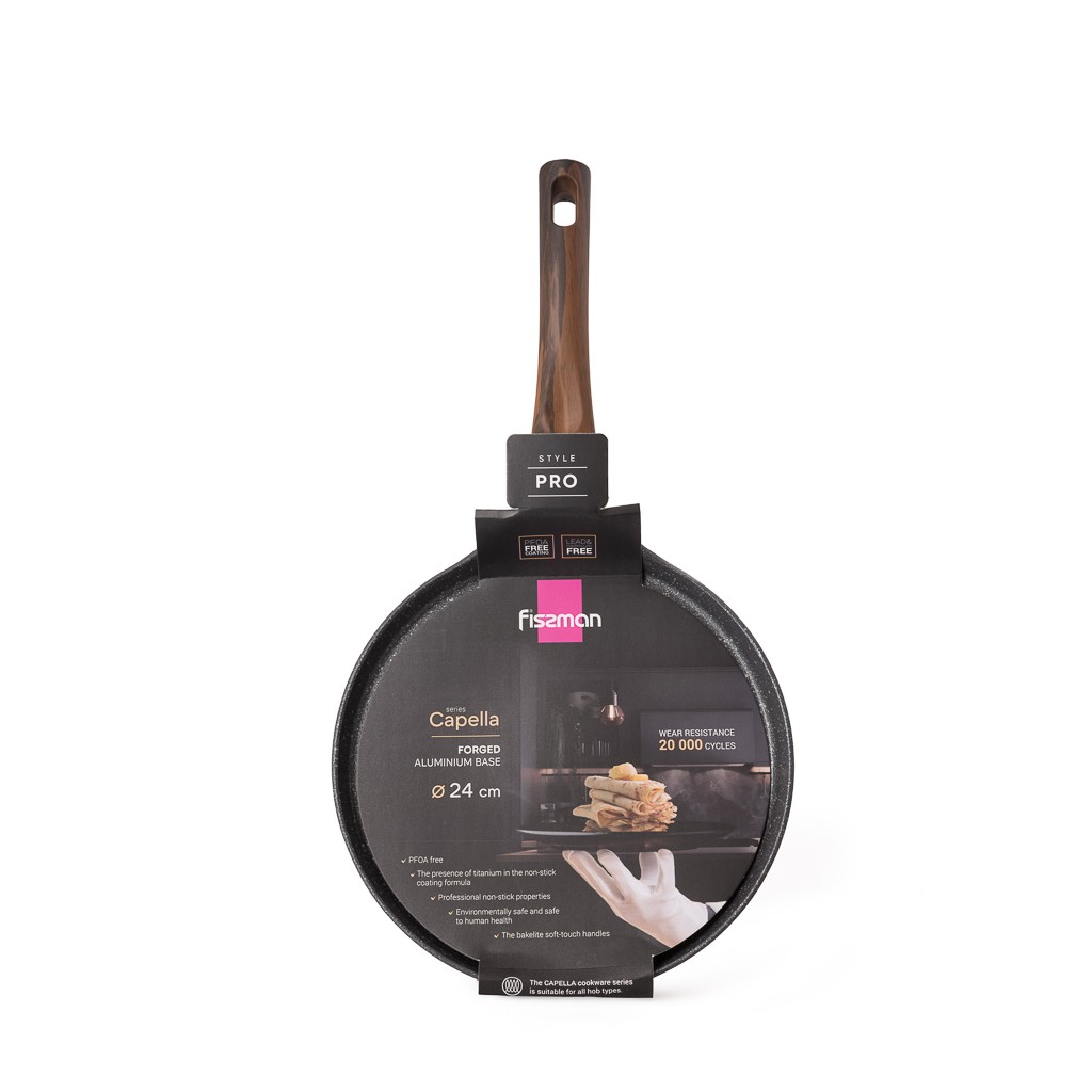 Признанный лидер в производстве кухонной посуды – компания FISSMAN, представляет серию CAPELLA с новейшим антипригарным покрытием TiPro. • Отличительной особенностью покрытия TiPro посуды серии CAPELLA является наличие титана в формуле антипригарного покрытия, что обеспечивает его особую прочность. • Благодаря качественному антипригарному слою покрытия TiPro можно использовать минимальное количество масла и готовить полезные низкокалорийные блюда, которые подходят для диетического питания. • Внутреннее покрытие TiPro не содержит PFOA, протестировано согласно инструкциям LFGB и FDA и подтверждено сертификатом TUV SUD. Сковороды серии CAPELLA отвечают международным требованиям безопасности для здоровья человека и окружающей среды. • Уникальные бакелитовые ручки с крепежом двумя болтами не расшатаются со временем. Ручки выполнены в благородном коричневом оттенке ‘под дерево’. Благодаря эффекту soft-touch они удобны в использовании, приятны на ощупь, не скользят, не нагреваются. • Посуду серии CAPELLA можно использовать на любой плите или варочной поверхности. Со сковородой CAPELLA, имеющей покрытие TiPro, торговой марки FISSMAN оригинальные новые рецепты и привычные, любимые блюда Вашей семьи всегда будут получаться вкусными, полезными, красивыми!
